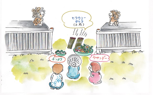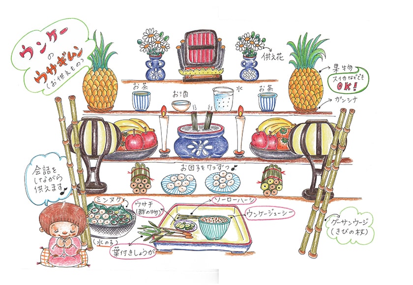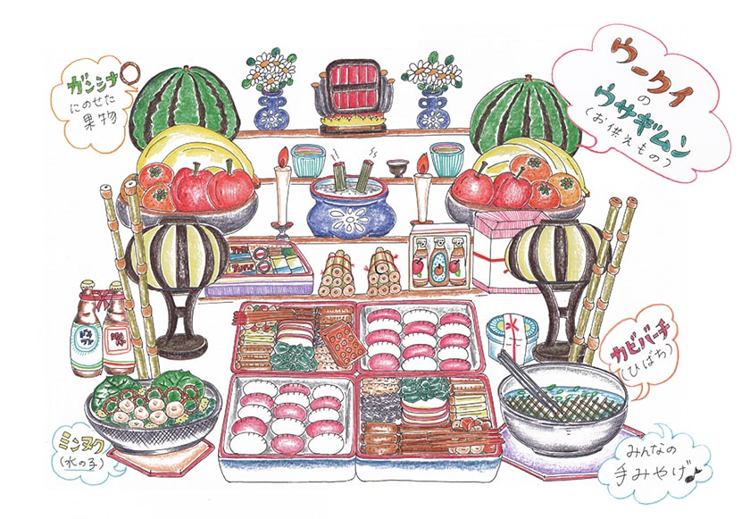 ですから、ウサギムン(お供え物)はほとんどウンケーと同じですが、ウサンミが加わります。上のイラストを参考にしながら、下記のウサギムンを用意してください。