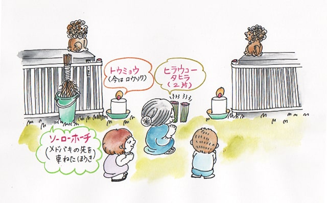 それから、門前で供えたヒラウコーを、「チネーサンムトゥカイ、アンネーサビラ(家まで案内しますね)」とお伝えしながら移動し、お仏壇のウコールに拝するとお迎えです。ロウソクも一緒にお仏壇まで運んでください。