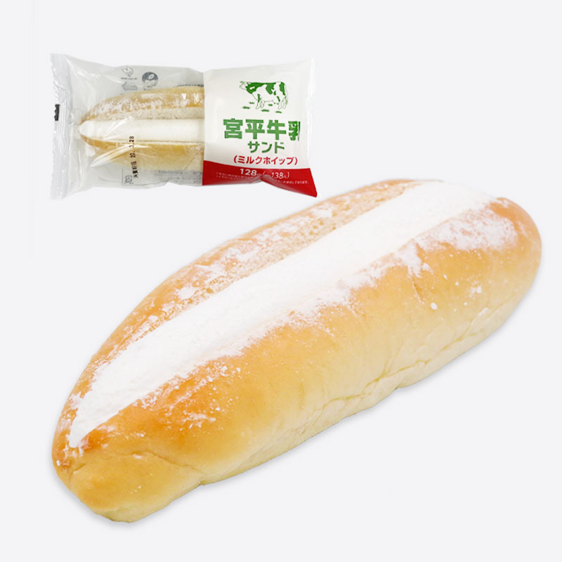 【宮平乳業と第一パンのコラボ商品】牛乳でこねあげた生地にホイップをサンドしました。 牛乳をたっぷり使用したミルクパンです。