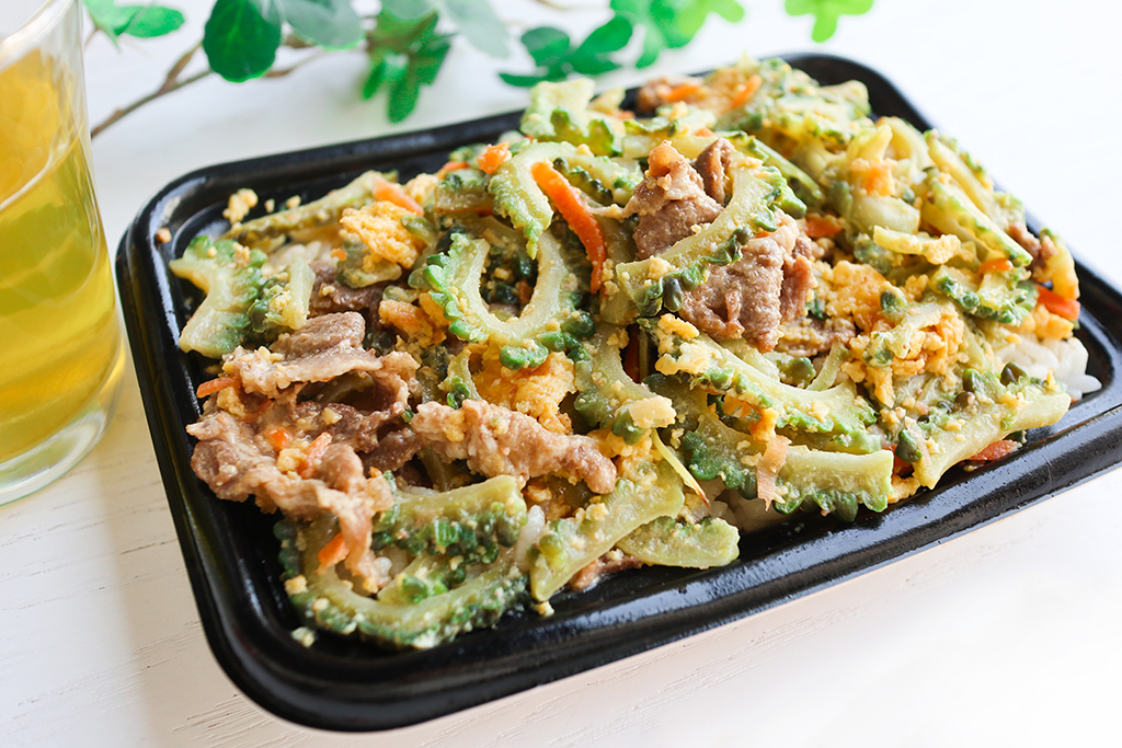 5月8日「ゴーヤーの日」に合わせてチャンプルーを20%増量しました!(1週間限定) 豚肉を塩麹で漬込むことで柔らかさと旨味がUP! ゴーヤーと相性の良い豚肉をだしと醤油で味付けた人気のゴーヤーチャンプルー弁当です。
