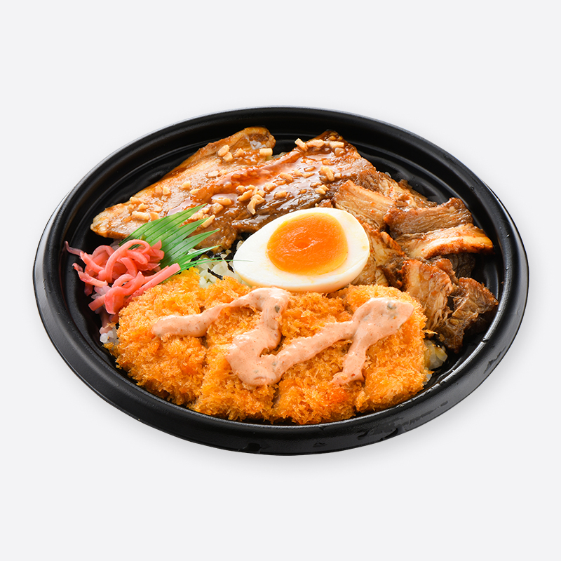 SPAMを使用したポークカツとガーリックを効かせたタレで焼いたチャーシューと甘辛タレで和えた2種類のチャーシューをたっぷりごはんの上に盛り付けました。
