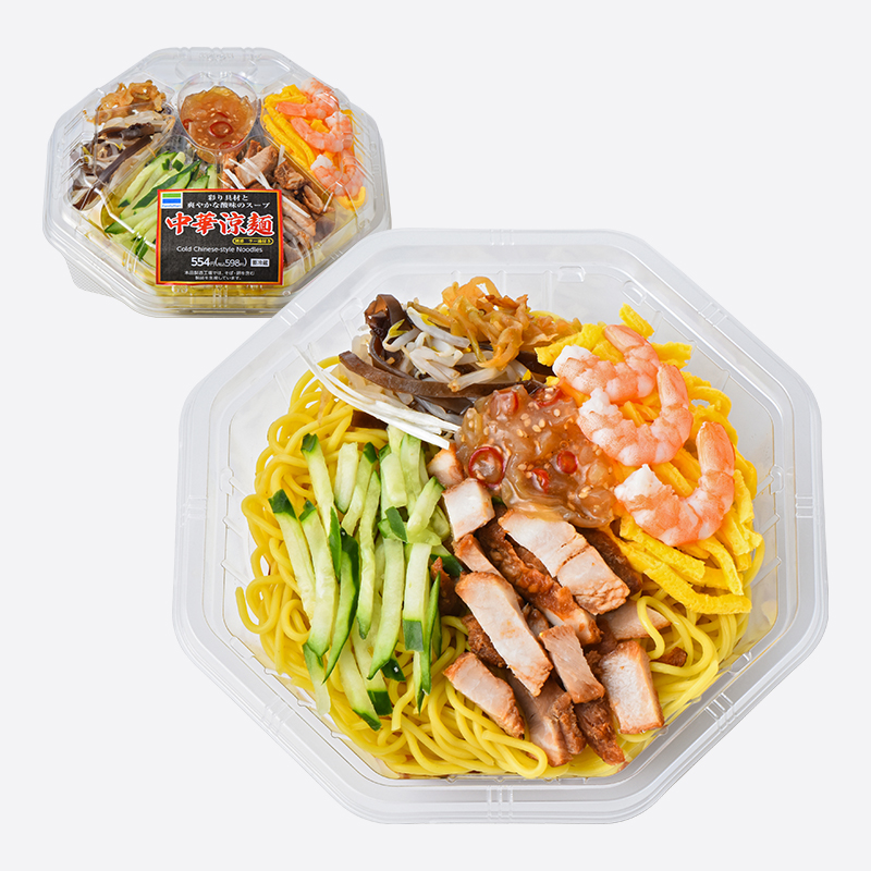 のどごしの良い自家製三層麺に海老、炙りチャーシュー白髪ねぎ添え、錦糸卵、胡瓜、くらげ、もやし、千切りザーサイの7種類の具材をトッピングした贅沢な冷し中華です。