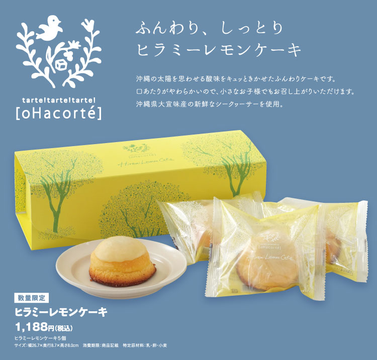 オハコルテの商品はタルト1つにしても試行錯誤を繰り返し、ボツになった商品も多いのですが、ヒラミーレモンケーキは試作1回目でほぼOKになりました。沖縄出身のパティシエの子が試作を作って、私が食べて「うん、OK」という感じで、スムーズに商品化できました。