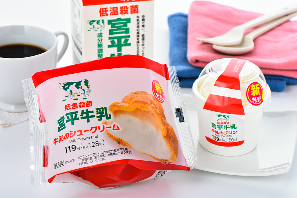 【宮平牛乳コラボ商品】県内唯一の低温殺菌牛乳を使用した、なめらかなミルクカスタードを詰めたシュークリームと、牛乳の濃厚な味わいを再現したプリン。牛乳プリンとホイップクリーム、ミルクソース全てに宮平の低温殺菌牛乳を使用。