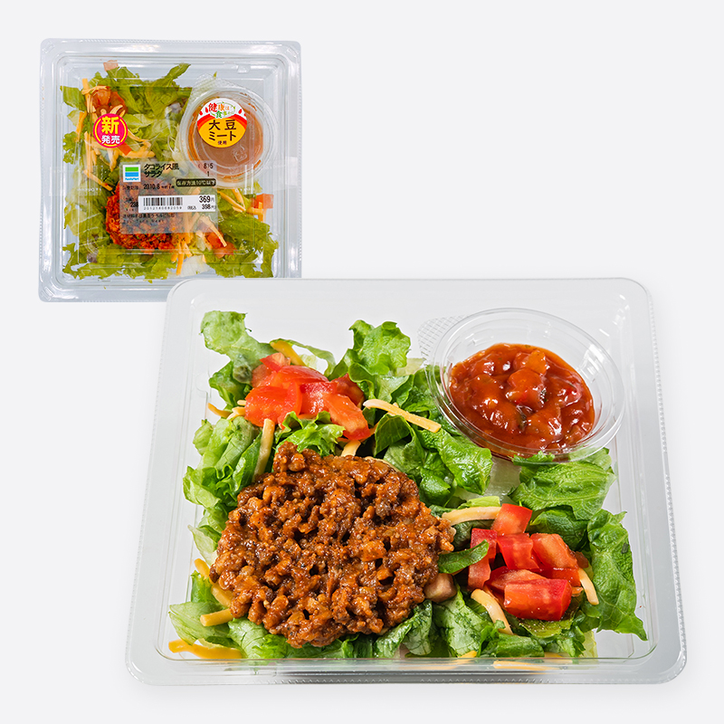 大豆ミート使用のタコスミート。ご飯の代わりに野菜と雑穀で食べるタコライス風仕立てのサラダです。