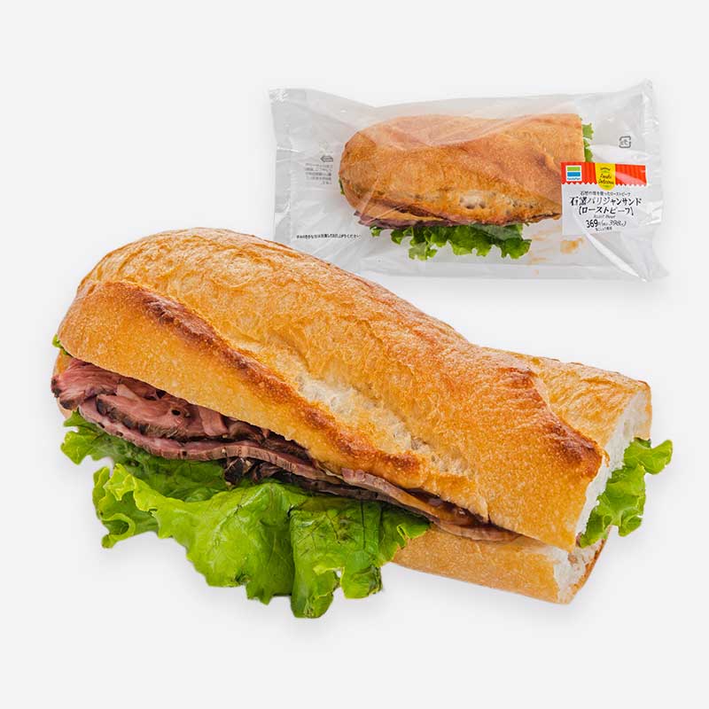 石窯パリジャンにしっとりとしたジューシーなローストビーフを組合わせたカフェ風サンド。玉ねぎ和風ソースと洋風わさびソースがアクセント。