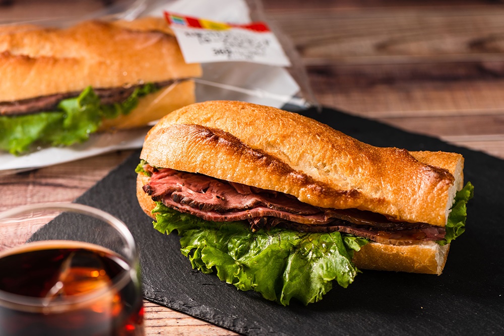 石窯パリジャンにしっとりとしたジューシーなローストビーフを組合わせたカフェ風サンド。玉ねぎ和風ソースと洋風わさびソースがアクセント。