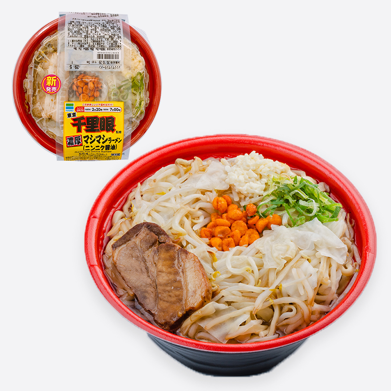 人気ラーメン店、千里眼監修。食べ応えと噛み応えのある太麵と白湯ガラベースに、にんにくと醤油を効かせ背油とラードを加えた厚みのあるスープが特徴のボリューム系ラーメンです。