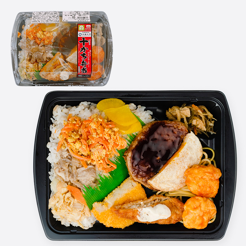「学P総集編」2008年度、沖縄大学考案商品。十種類のおかずを盛合わせたボリュームのある幕の内弁当。人気具材のコロッケ、目玉焼き、ハンバーグ、チキン、白身フライと沖縄らしい副菜を多数トッピング。