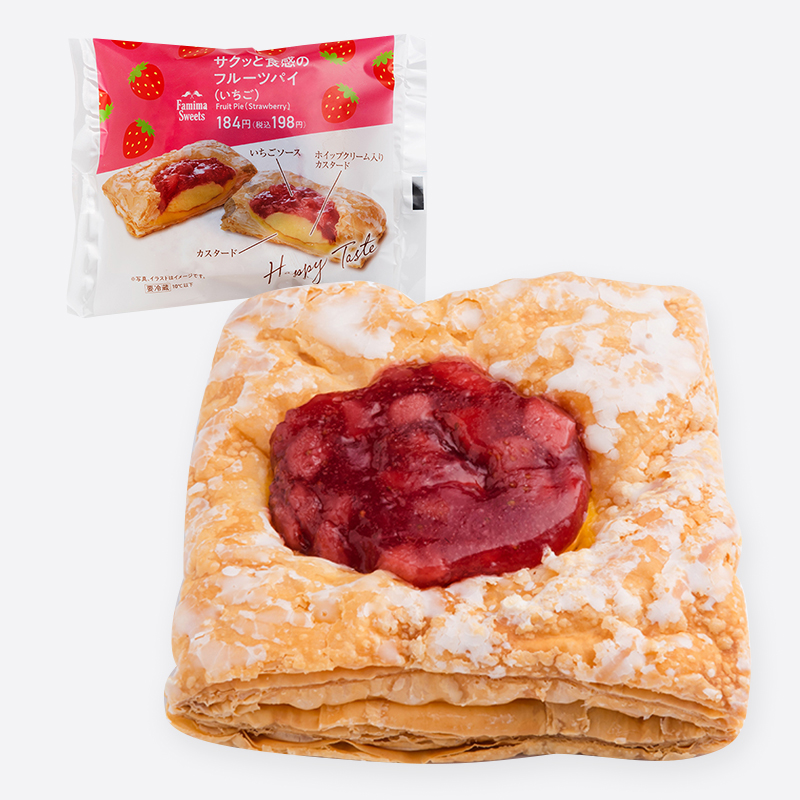 バターの香り豊かなサクッと食感のパイ生地に、カスタードクリームと苺の果肉入りソースをトッピングしました。