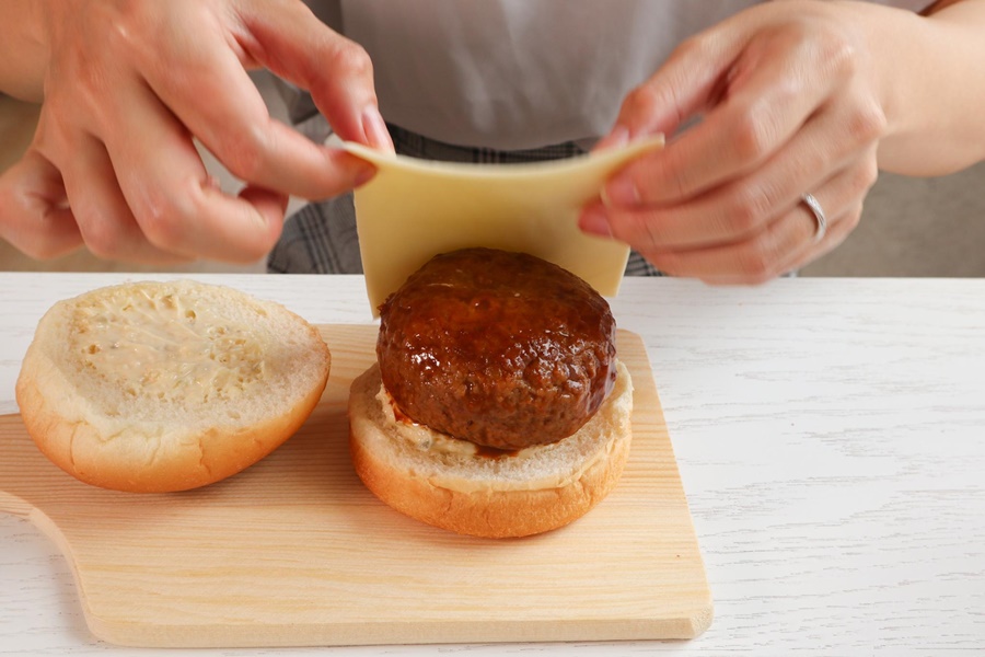 思ったよりサイズが大きくて不安になりました。ハンバーグがとても重いです。気を取り直してチーズをのせてみることに。