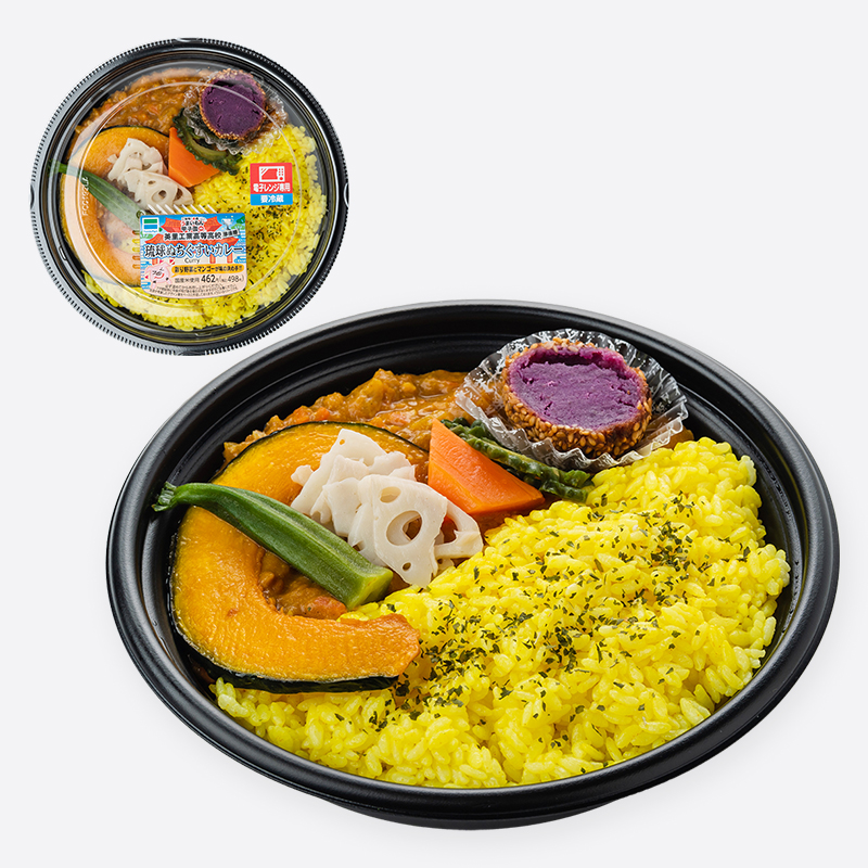 美里工業高校が考案した「2020うまいもん甲子園」準優勝メニュー。隠し味にマンゴーピューレが入った甘さのあるキーマカレーに彩のよい野菜をトッピングしました。