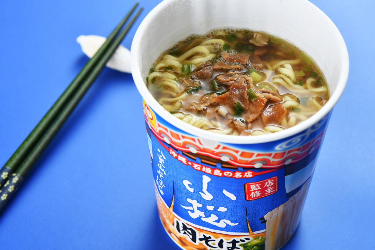 石垣島の人気店「八重山そば処 小松」監修のカップ麺。鰹・豚・鶏の旨みを利かせたこだわりのスープが特徴です。