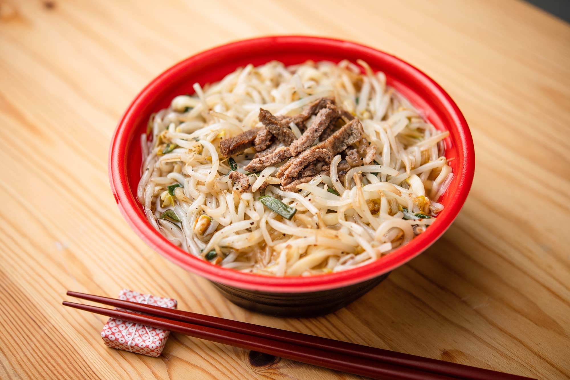 もちもちの自家製ちぢれ麺を使用し、もやし・ニラ炒め・牛肉をどっさりトッピング。