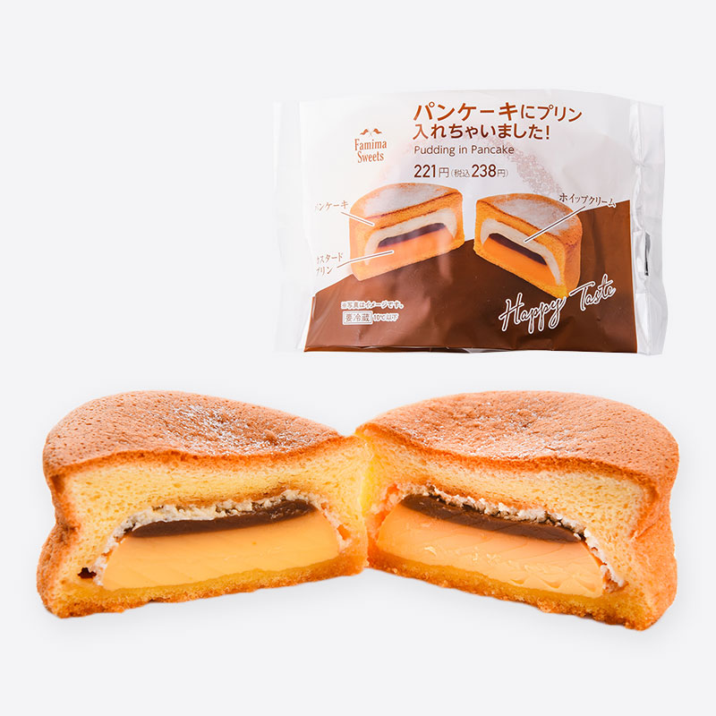 人気のハイブリッドスイーツを好評なハンドタイプで展開。プリンがそのままパンケーキの中に入った、美味しさと同時に驚きと楽しさも味わえるスイーツ。北海道産生クリームをブレンドしたホイップ使用。