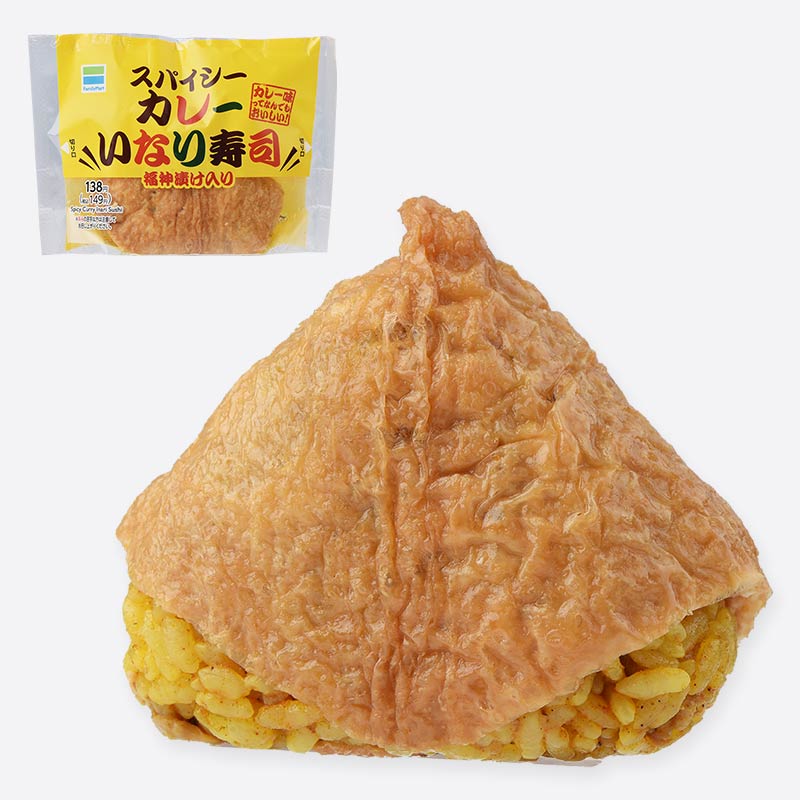 【ファミマ 夏のカレー祭り対象商品】カレー酢飯に鶏そぼろ炒めと食感のアクセントに福神漬けを混ぜ込んだ、いなり皮の甘さに負けないしっかりした味付けのいなり寿司です。