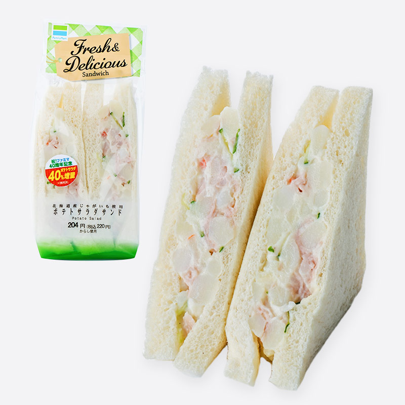 40%増量作戦対象商品。北海道のじゃがいもを使用したポテトサラダを期間限定で増量。