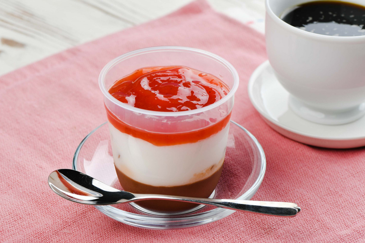 沖縄県立北部農林高校考案商品。本部町産アセローラを使用したソースに、ミルクムース、チョコプリンの三つの味わいがマッチしたカップスイーツです。