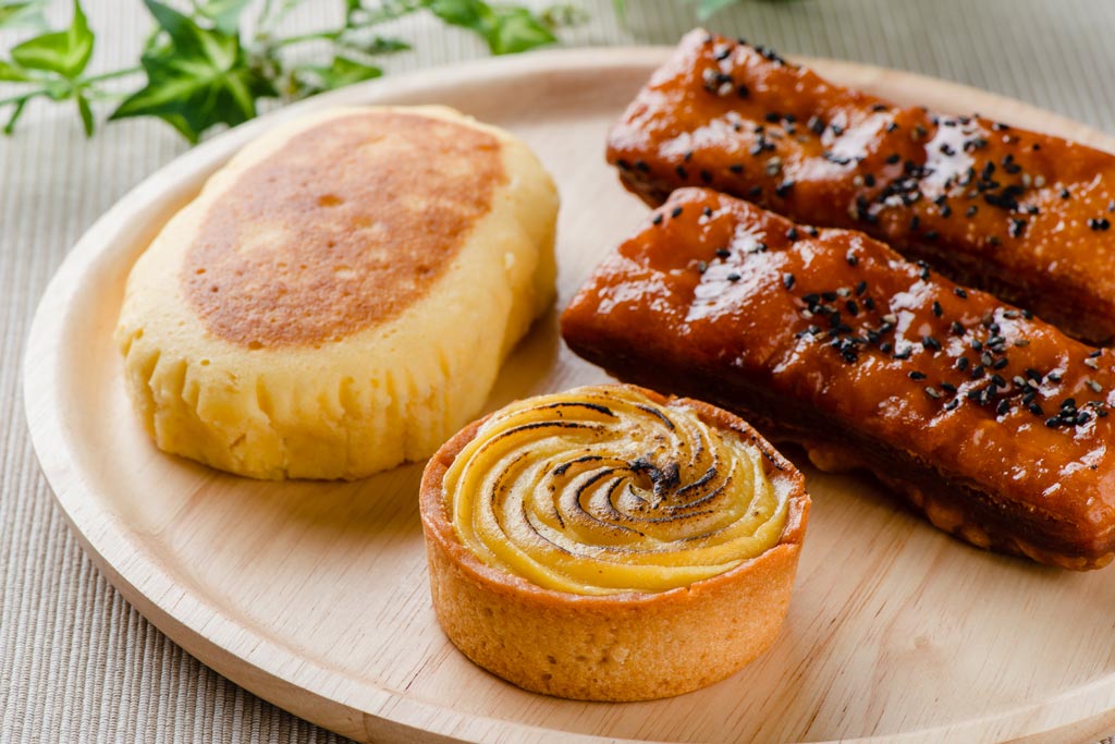 【ファミマのお芋堀り対象商品】の、大学芋なスティックドーナツ 138円(税込)と、スイートポテト蒸しケーキ 138円(税込)、紅はるかのスイートポテトタルト 210円(税込)もおすすめ。