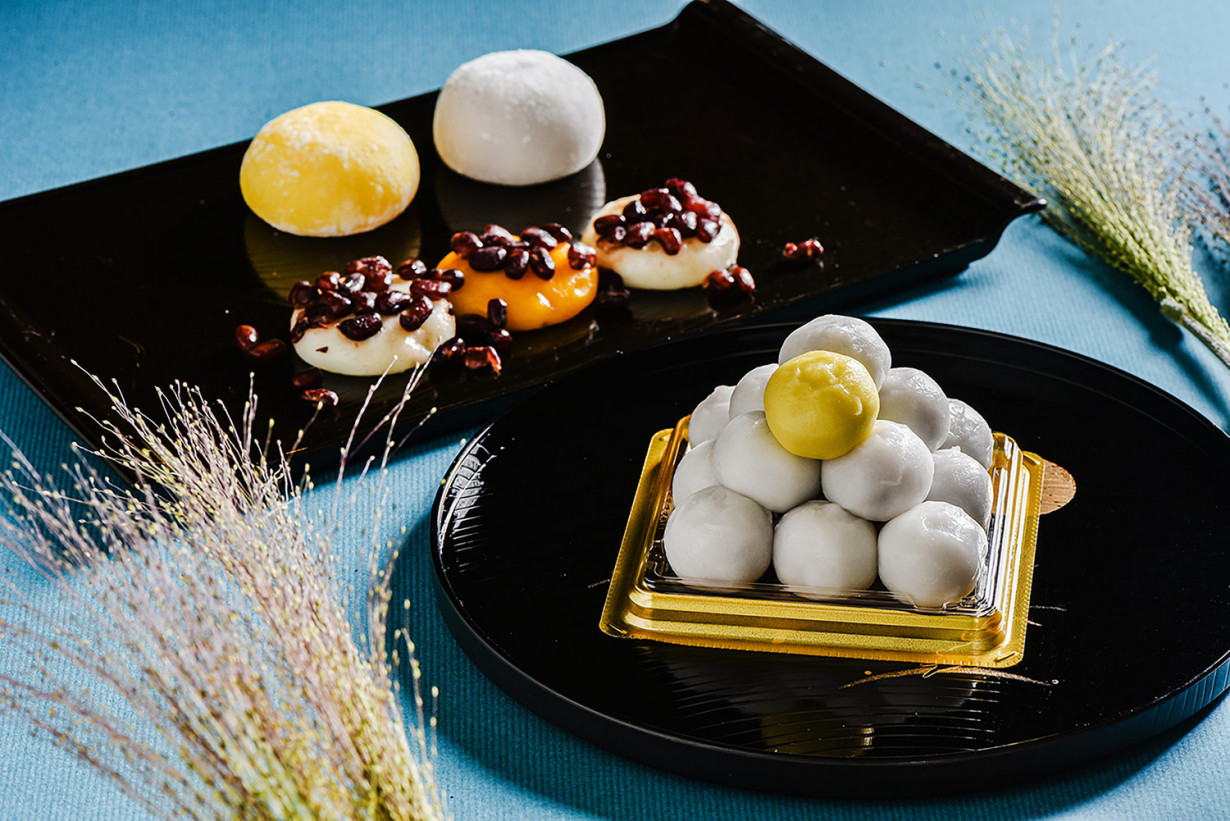 秋の十五夜にあわせた、お月見だんご 298円(税込)と二色のふちゃぎ 198円(税込)もおすすめ。