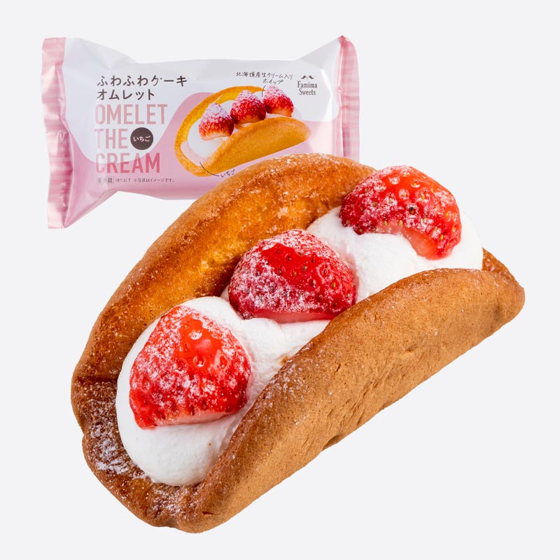 【ファミマのいちご収穫祭対象商品】北海道産生クリームをブレンドしたホイップクリームといちごカスタードを、こだわりのふわっふわオムレット生地で包み、フレッシュ苺をトッピングしました。