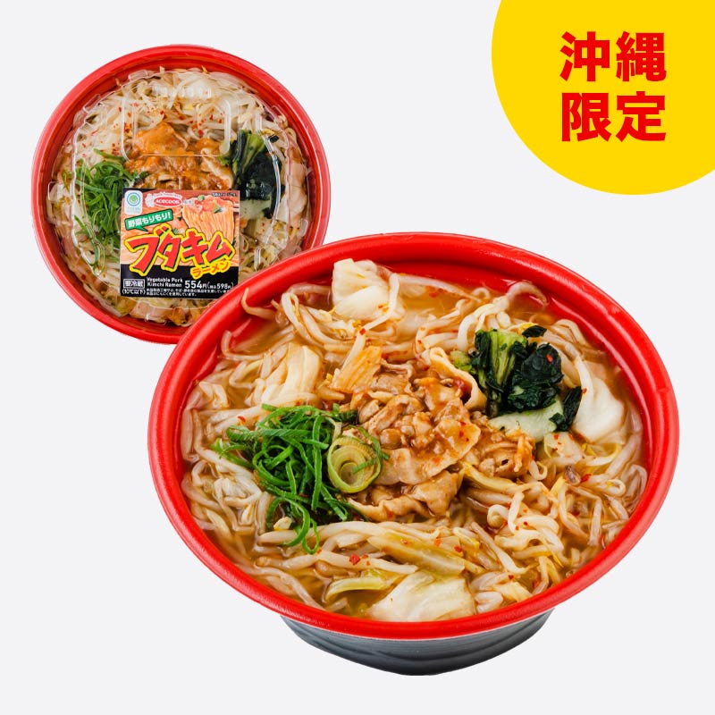 【エースコックコラボ商品】ブタキムの味わいをベースに、チルド商品ならではの「具材感」をもりもりの野菜で表現。豚キムチ炒め、チンゲン菜、ねぎにたっぷりのもやしキャベツボイルをトッピングしました。