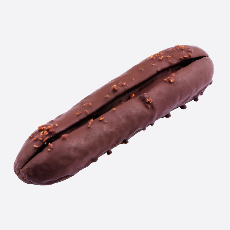 アーモンド付きのチョコ味のパン生地に、ザクザク食感のパフ入りチョコクリームをサンドし、チョコでコーティングしました。