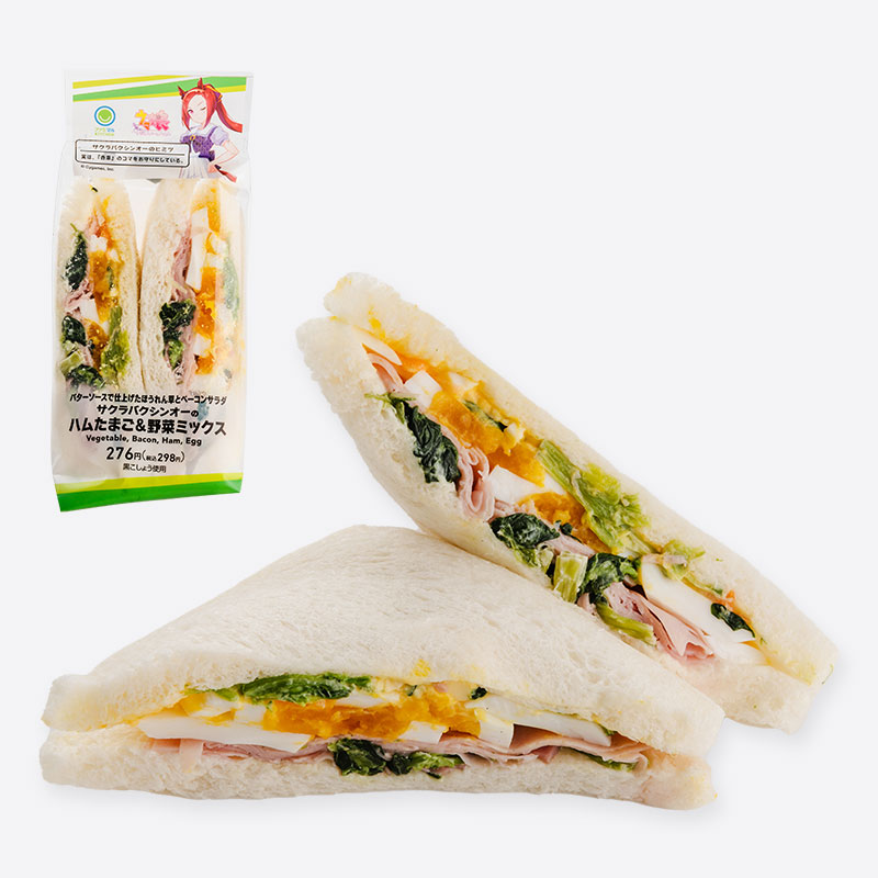 【ウマ娘プリティーダービーコラボ商品】きゅうりと人参を混ぜたタマゴサラダ、ベーコンを混ぜたほうれん草、茹で卵、ポークハムを組み合わせたサンドイッチです。