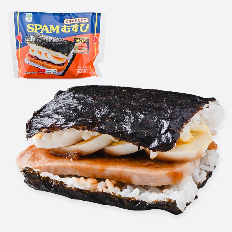 スパムとゆで卵を合わせ、ピクルスをいれたマヨソースをトッピングしたボリュームのあるおむすびです。