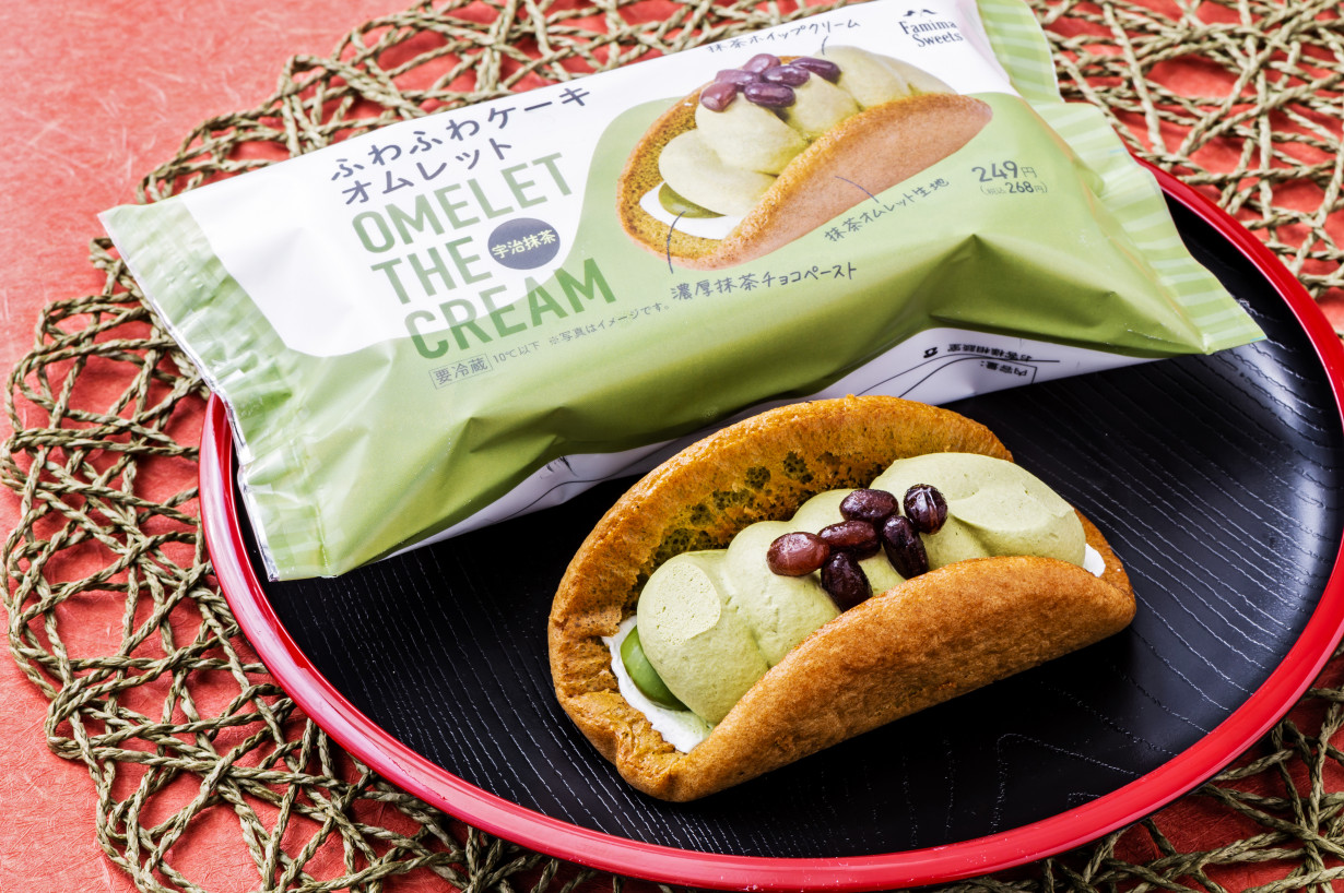 今回のおすすめは、「宇治抹茶まみれ」対象商品の「ふわふわケーキオムレット宇治抹茶」。濃厚な抹茶チョコペーストと抹茶ホイップ、北海道産生クリームをブレンドしたホイップクリームをふわっふわの抹茶オムレット生地で包み、かのこ小豆をトッピングしました。