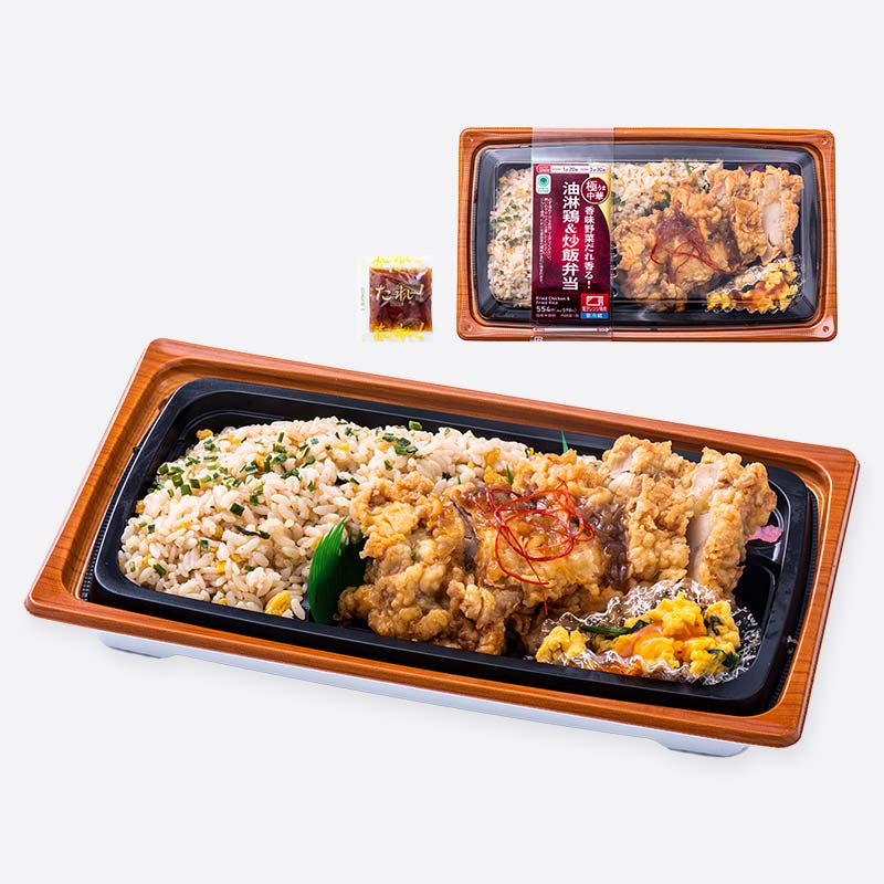 ネギや生姜を使用した香味野菜風味のタレで食べる油淋鶏と、醤油ベースの炒飯を組み合わせた、ボリューム感のあるお弁当です。