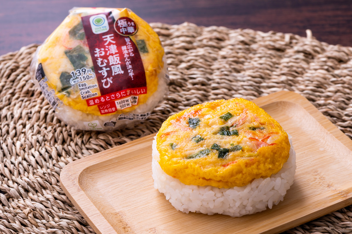 今回のおすすめは、「天津飯風おむすび」です。 カニカマ、ネギ入りの玉子焼きに、生姜、オイスターソースを加えた醤油だれで味付けした天津飯風のおむすびです。