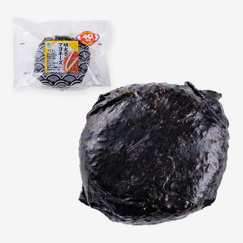 「40%増量作戦」対象商品。人気の明太子マヨネーズをお値段そのままで、ご飯、具材、海苔を期間限定で40%増量しました。