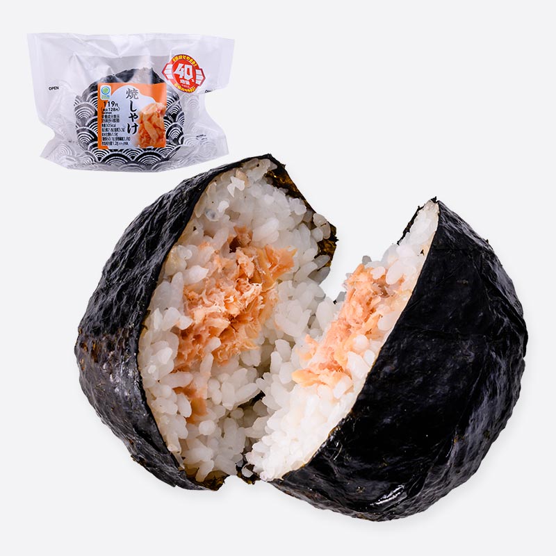 「40%増量作戦」対象商品。人気の焼しゃけのご飯、具材、海苔をお値段そのままで増量しました。