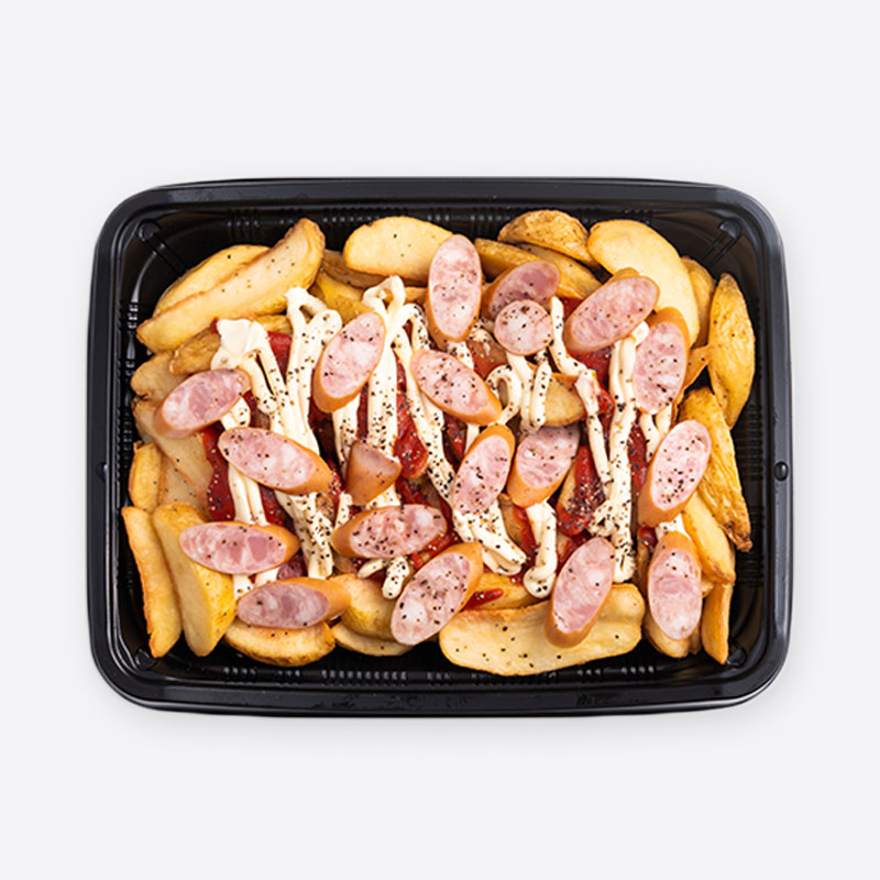 「40%増量作戦」対象商品。ケチャップ、マヨネーズ、黒胡椒で味付けした、ウインナーとたっぷりポテトの盛り合わせです。価格そのまま期間限定で40%増量。