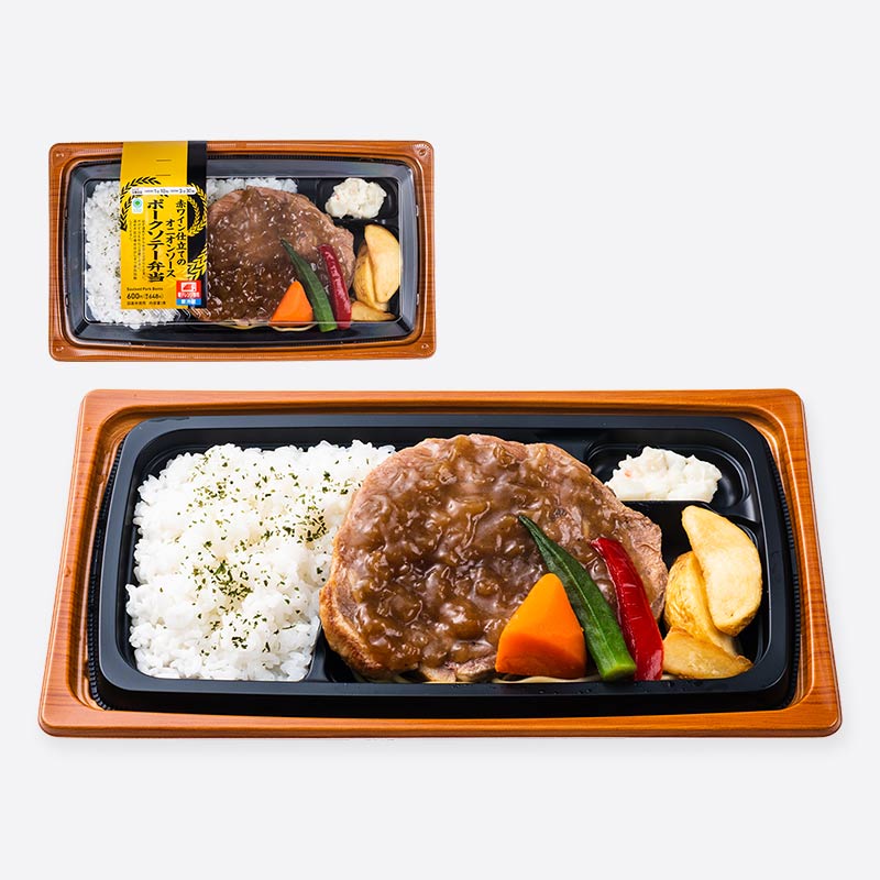 食べ応えがあり、適度な脂身と旨みがあるポークソテー弁当です。ソースには赤ワインや玉ねぎを使用し、コクと玉ねぎの甘味が感じられる仕立てです。