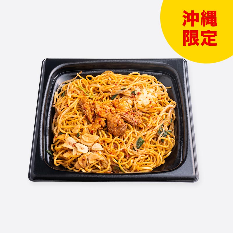 【オキナワファミマのにんにくグルメ商品】 醤油とラー油、一味唐辛子で味付けした辛旨な焼そばに、みじん切りにんにく、フライドガーリックをトッピングしました。