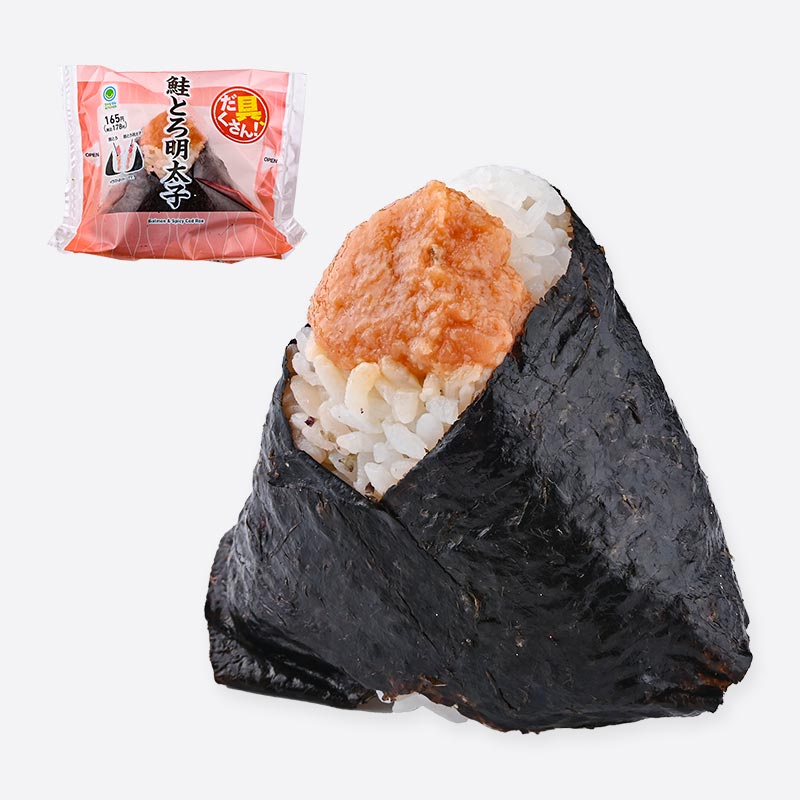 醤油和えと明太子和えの2種類の鮭とろを包んだおむすびです。
