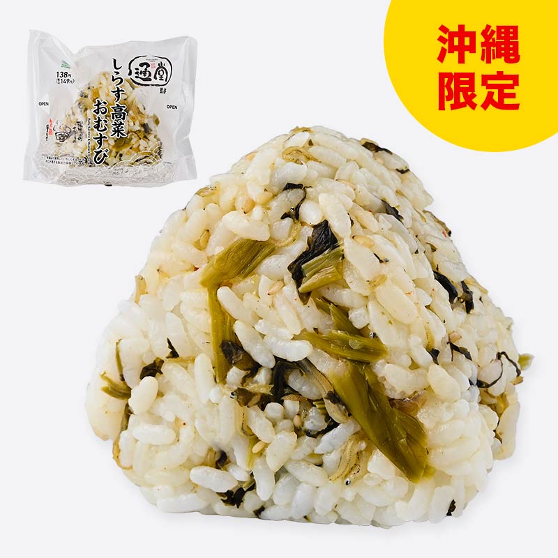人気ラーメン店「琉球新麺 通堂」コラボ商品。食感の良い阿蘇高菜と、旨味の効いた瀬戸内産しらすをふんだんに使用したおむすびです。