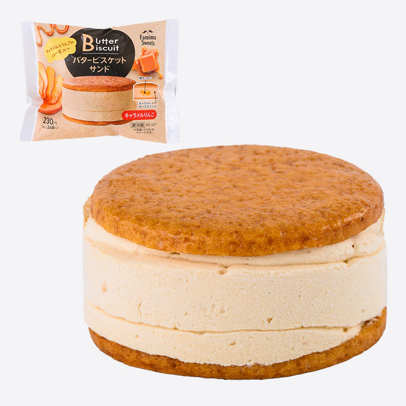人気のフラッペとバタービスケットサンドのコラボ商品。こんがり焼き上げた発酵バター入りのビスケットで、キャラメルチーズクリームをサンドしました。