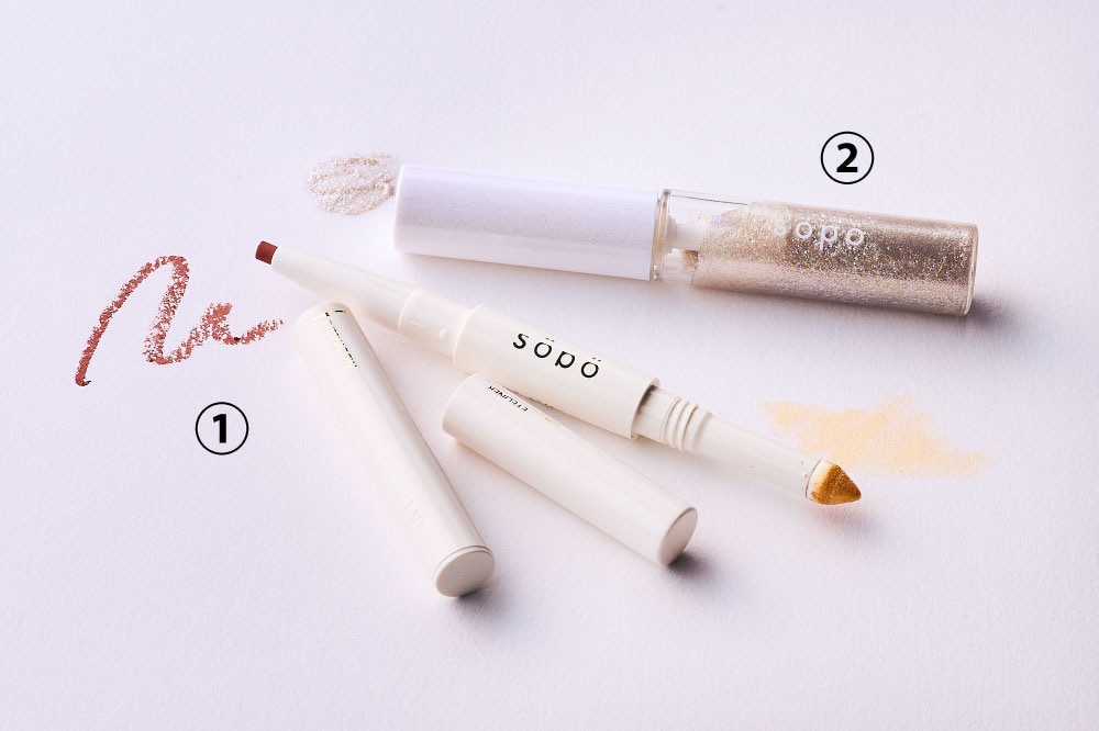 1本でトレンドカラーの目元が作れるパウダー&ライナーと、細かなラメで上品な輝きを放つグリッターを使用します。