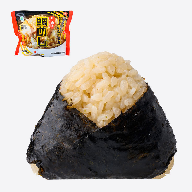 鯛のほぐし身をごはんと一緒に炊き込み、中の具材にも鯛の醤油和えを使用した、贅沢な仕立てのおむすびです。