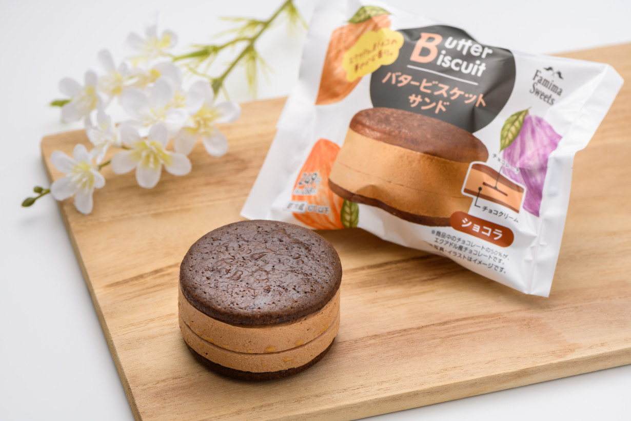 今週のおすすめは、「バタービスケットサンド ショコラ」です。華やかな香りのファミリーマートオリジナルチョコ(エクアドル産)を使用したバタービスケットサンドです。発酵バター入りココアビスケットで、濃厚なチョコクリームとパキッと食感のチョコレートをサンドしました。