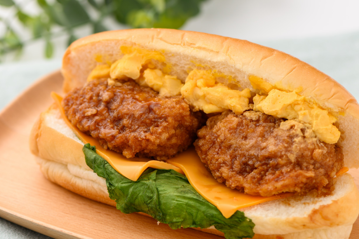 また、「チキンカツコッペ」もおすすめです。甘辛たれで味付けした鶏むね肉のチキンカツと、スライスチーズ、タマゴサラダ、リーフレタスをサンドした満足感のあるコッペパンです。