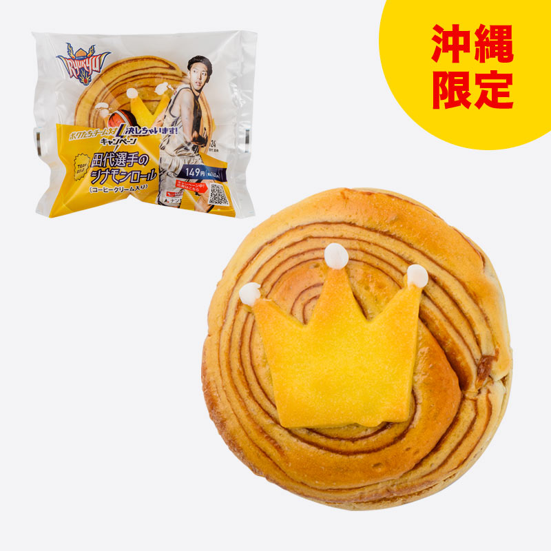【琉球ゴールデンキングスコラボ商品】 シナモンロールにコーヒーフィリングをサンドし、キングスの名にふさわしい王冠をのせて焼き上げました。