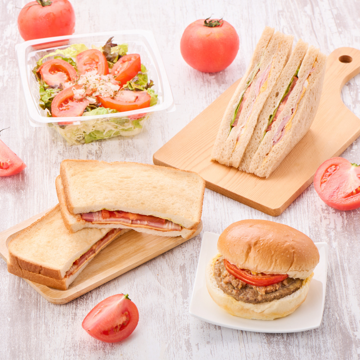 今週のおすすめは、豊見城産「ちゅらとまと」を使用した4アイテム!「ちゅらとまと」は緻密な果肉と濃厚な味わいが特徴のとまとです。今回は「サンドイッチ」「サラダ」「バーガー」で商品化しました。