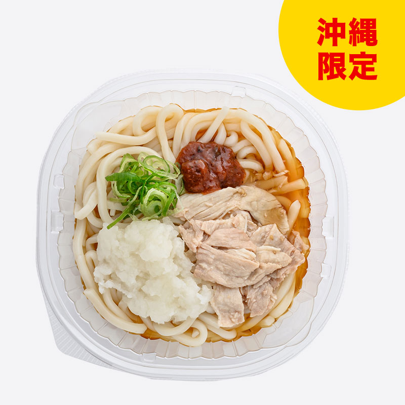 沖縄で人気の調味食品「山海ぶし」を使用。豚肉と粗めの大根おろしに、旨味のある梅かつおがマッチした冷しうどんです。
