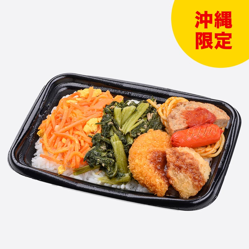 チキナー炒めと人参コンビーフ炒めをごはんの上にトッピングし、コロッケ、チキンカツ、ハンバーグ、赤ウインナー、ナポリタンを盛り付けた、バラエティ豊かなお弁当です。