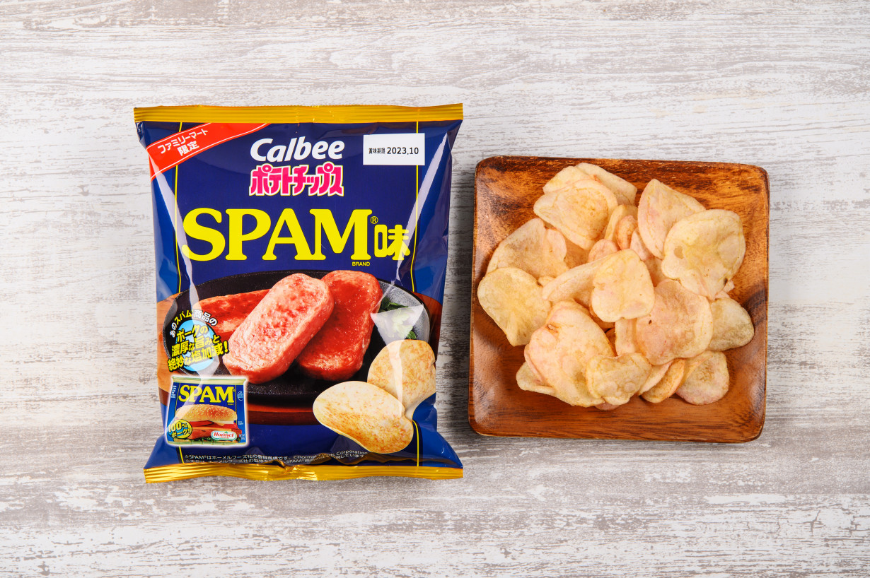 また、「ポテトチップス SPAM®味」もおすすめです。ホーメルフーズ社監修「SPAM®」とのコラボ商品です。ポークエキスパウダーを配合し、ジューシーに焼いたポーク独特のうま味をイメージしました。ポテトチップスの赤みがかった色味も「SPAM®」を表現しています。数量限定商品です。