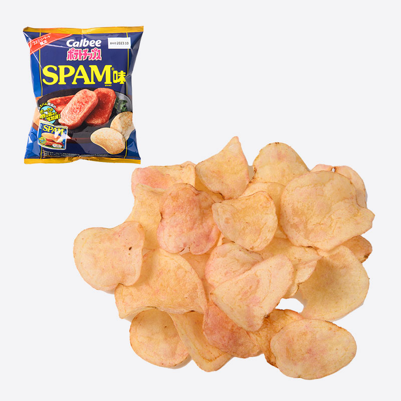 【ファミリーマート限定】ホーメルフーズ社監修「SPAM®」とのコラボ商品です。ポークエキスパウダーを配合し、ジューシーに焼いたポーク独特のうま味をイメージしました。ポテトチップスの赤みがかった色味も「SPAM®」を表現しています。(数量限定)